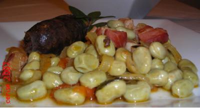 Pelar una de las butifarras y desmenuzarla y echarla en la cazuela. remover todo y añadir la habas, dejándolas que se rehoguen ligeramente. Añadir el vaso de vino, la otra butifarra, el tocino y las hojas de menta. Salar al gusto y remover todo bien con la cuchara de palo. Bajar el fuego y dejar cocer, a fuego lento, con la cazuela bien tapada, hasta que las habas estén bien tiernas. Añadirles una copita de anís, remover todo bien y apartar del fuego.